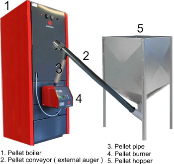 The pellet conveyor (external auger) transports pellets from the pellet container to the burner. The burner controls the work of the external auger. The external auger is connected to the burner with a special ∅ 60mm hose. The hose is made of melting polyurethane material. It acts as a safety measure against back-burning because melts in back-burning.